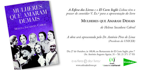 Outubro 25, 2010 Apresentação de "Mulheres que Amaram Demais" de Helena Sacadura Cabral. Quarta-feira, 27 de Outubro, 18h30, El Corte Inglés Tags:aesferadoslivrosdivulgação editorial link do post comentar favorito