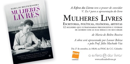 Setembro 26, 2012 Apresentação de "Mulheres Livres" de Maria de Belém. Dia 27 de Setembro, 18h30, Fnac Colombo Tags:aesferadoslivrosdivulgação editorial link do post comentar favorito
